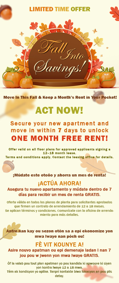 Secure your new apartment and move in within 7 days to unlock One Month Free Rent. Don’t wait, save your spot today! Offer valid on all floor plans for approved applicants signing a 12–18 month lease.